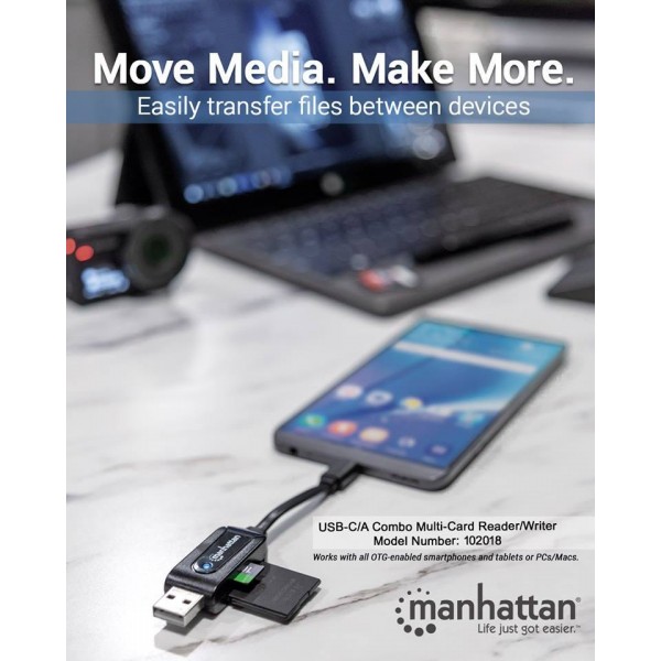 El lector / grabador de múltiples tarjetas Combo USB-C / A de Manhattan es un lector de tarjetas versátil que le permite conectar fácilmente una tarjeta SD, MMC o microSD a su teléfono inteligente o tableta con capacidad Ultrabook, Mac y OTG, así como a su computadora portátil o de escritorio computadora. El lector / grabador de múltiples tarjetas USB USB-C / A combinado se conecta al puerto USB tipo C o tipo A de su dispositivo, lo que le permite leer y escribir en prácticamente cualquier tarjeta de datos estándar 24 en 1 ( SD, MMC o microSD).