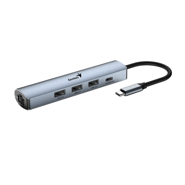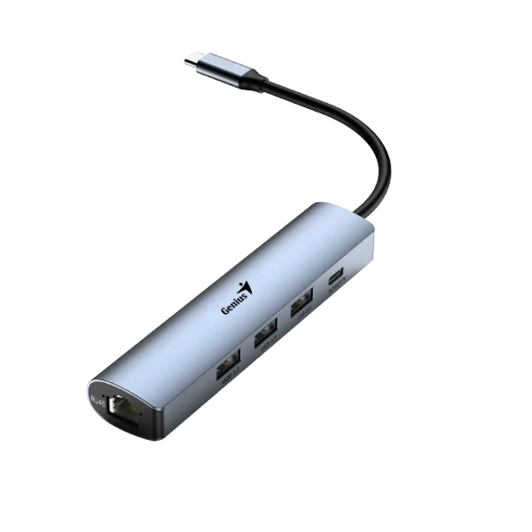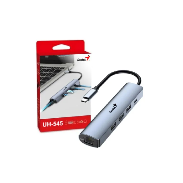 La última versatibilidad de Genius UH-545 contiene 5 puertos de USB, incluyendoEthernet Gigabit RJ45, 1 puerto USB-C (carga) y 3 puertos USB-A 3.0 (datos)