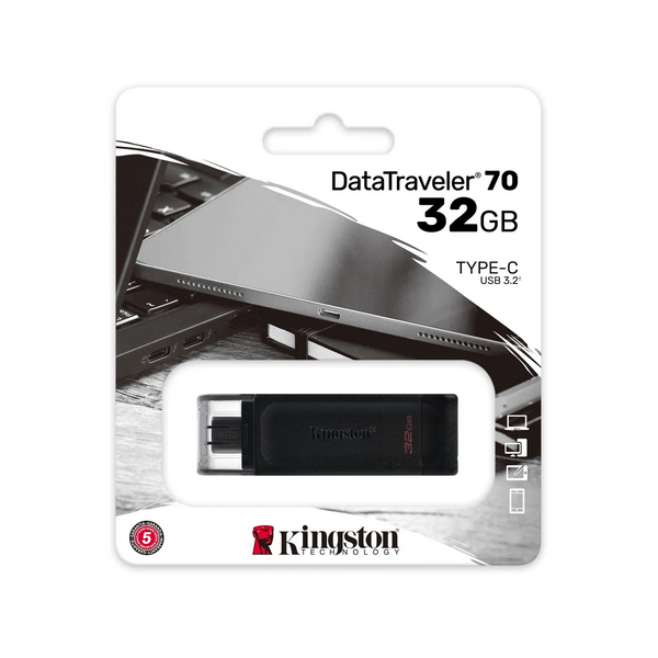 Kingston’s DataTraveler® 70 es una unidad Flash USB-C® ligera, portátil y compatible con la norma USB 3.2 Gen 1. Ha sido diseñada para dispositivos compatibles con USB-C, como notebooks, portátiles, tabletas y teléfonos inteligentes. La DataTraveler 70 tiene todo lo necesario para ampliar su almacenamiento en el día a día.